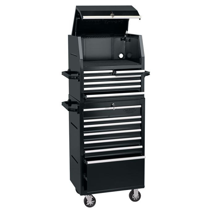 Expert Quality, thirteen drawer, professional combined roller cabinet and tool chest. Attached with braked and swiveling castors and fitted with a side dump bin, side tool storage rack and soft grip pulling handles for easy manoeuvrability. The reinforced lid is fitted with supportive gas struts and two soft grip handles. Manufactured from thick sheet steel with a protective powder coated finish. Drawers are fitted with an aluminium trim, 3mm EVA foam linings, auto retention ball bearing runners delivering a smoother operation and a secure locking system with two keys. Each tool cabinet is also supplied with a EVA top mat. Carton packed on pallet.