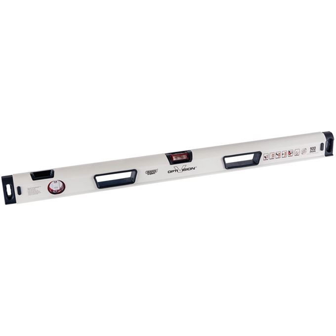 Expert Quality, tough aluminium box section levels comprising two highly visible ‘Opti-Vision’ solid acrylic UV resistant vials, a reinforced horizontal vial with gradient lines and a vertical vial with side view into a patented curved profile for enhanced visibility. Electrostatically epoxy powder coated and baked for maximum protection. Fitted with ‘Ergo-Grip’™ non-slip handle on 60cm and two on 90cm, oversized bi-material shock absorbing end caps and two rare earth magnets. The base has a finely milled surface. Accuracy 0.5mm per 1M = 0.029° in standard position.