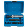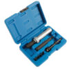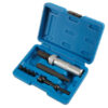 Air hammer driven impact driver designed to release hard to remove seized and rusted fixings. The kit includes an air hammer adaptor, soft rubber coated side handle and four 5/16″ hex shank bits: Phillips PH2 and PH4 and flat 8mm and 10mm. The tool combines an air powered hammering force with the impact driver’s turning action to loosen the hardest to release components. This bi-directional driver works with both left and right-hand threads and features a half inch square drive, for use with an impact socket, ideal for nuts and bolts. A professional kit and a useful problem solver in the automotive workshop.