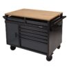 Part of the BUNKER® storage range. This robust 48″ multifunctional mobile cabinet offers excellent tool storage and workspace capabilities. It has access from both sides and includes 14 drawers, a worktop and a double-sided storage cupboard with a shelf. There are also pegboards on the two side panels for hanging tools and equipment, with a paper towel holder and ample space for storing cans. Made from premium-quality steel, the unit has a matt grey textured finish which is highly durable, thanks to the industrial powder coating that protects against scratches, wear and corrosion. This stylish look is further enhanced with a black anodised aluminium trim. Each drawer has a smooth soft-close operation and is lined with lush foam to protect your tools. The 25mm-thick hardwood worktop spans the whole surface of the unit, providing a handy workspace. For ease of manoeuvrability, there is a steel handle and four durable castor wheels. Two of the wheels are fitted with brakes to keep the tool cabinet still. It has an integral lock for security and is supplied with two keys. The unit requires partial assembly and measures W 1,430 x H 1,009 x D 800mm. For your quality assurance, all BUNKER® units include a 10-year warranty.