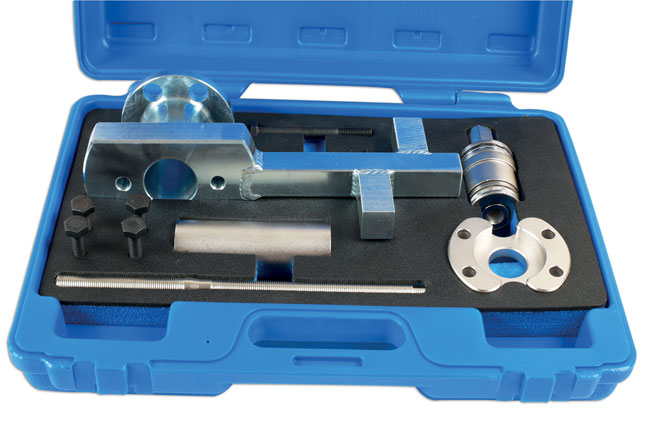 7415 is the set of tools required for the removal of the front crankshaft pulley (crankshaft vibration damper) fitted to the Jaguar and Land Rover 3.0L V6 and 5.0L V8 petrol engines. The crankshaft pulleys used on these engines are tightened to 200Nm + 270 degrees so are very tight to undo and must be held by a substantial holding tool which the kit provides. Also included in the kit are the pulley puller components required to remove the pulley without damage.