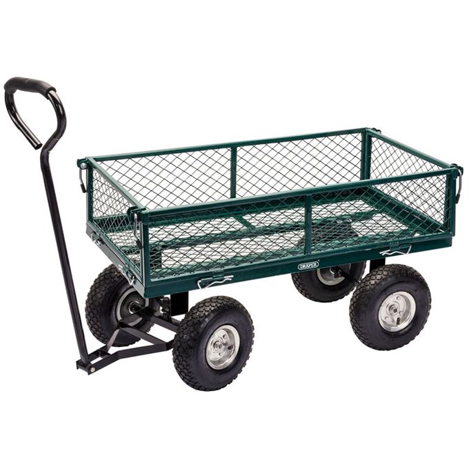 Steel fabricated cart with fold down sides, foam handle and heavy-duty pneumatic wheels. The handle on Stock No. 85634 easily converts for towing, making light work of moving heavy material. A heavy duty waterproof liner is available separately.