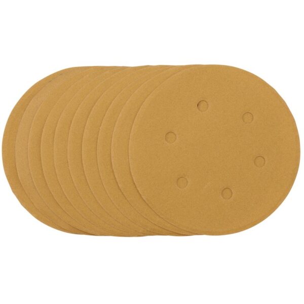 Pack of 10 gold sanding discs made from aluminium oxide with a special treatment of calcium stearate which is resin bonded to provide self-sharpening and anti-clogging performance. The heavy-duty D-Weight backing paper makes the sanding disc more durable – able to withstand the toughest jobs. The hook and loop backing offers decent adhesion to facilitate the fast changing of sanding discs. The six pre-punched 8mm holes improve the dust extraction during sanding. Ideal for sanding and finishing wood, metals – including ferrous alloys, painted surfaces, varnish, plastic and fillers. Compatible with all 150mm random orbit sanders with a hook and loop backing pad, including Draper Stock No. 65084, 83942 and 84125.
