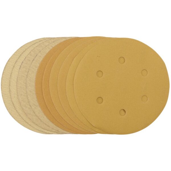 Pack of 10 gold sanding discs made from aluminium oxide with a special treatment of calcium stearate which is resin bonded to provide self-sharpening and anti-clogging performance. The heavy-duty D-Weight backing paper makes the sanding disc more durable – able to withstand the toughest jobs. The hook and loop backing offers decent adhesion to facilitate the fast changing of sanding discs. The six pre-punched 8mm holes improve the dust extraction during sanding. Ideal for sanding and finishing wood, metals – including ferrous alloys, painted surfaces, varnish, plastic and fillers. Compatible with all 150mm random orbit sanders with a hook and loop backing pad, including Draper Stock No. 65084, 83942 and 84125.