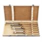 Hardened blades with brass ferrules. Ash handles. Packed in wooden storage box.