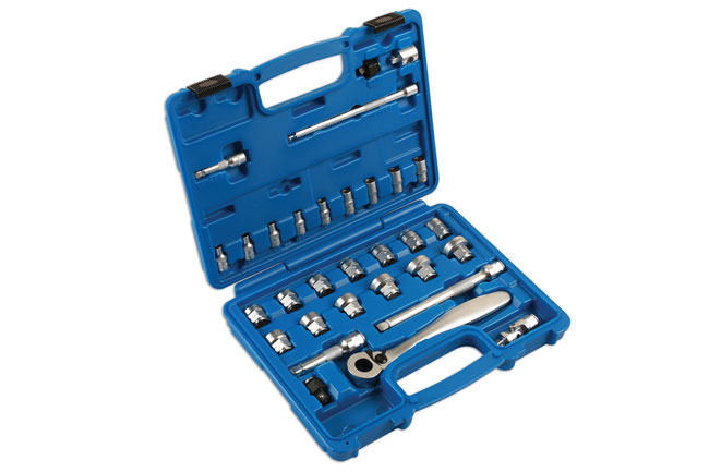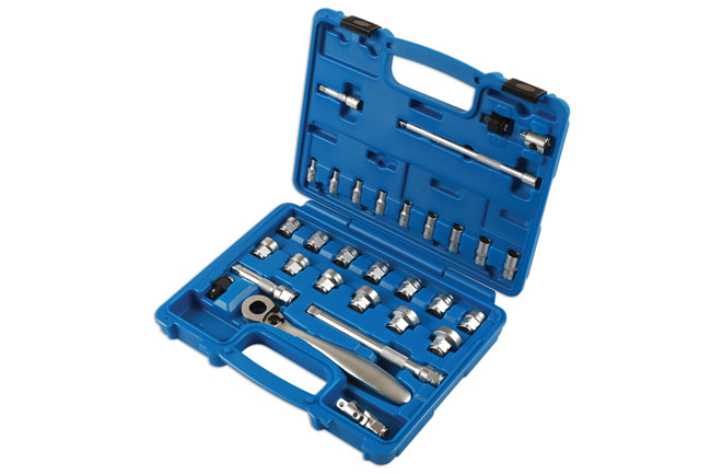 13 x super short sockets, 25mm long: 8, 9, 10, 11, 12, 13, 14, 15, 16, 17, 19, 21, 22mm with 3/8″D or 17mm Hex Drive.