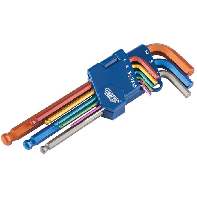 Expert Quality, key set with hexagon ball end on the long arm and conventional hexagon end on the short arm. Blades manufactured from S2 steel hardened and tempered with a coloured satin finish. Each colour signifies a different size. Supplied in fold-out easy release holder. Display packed.
