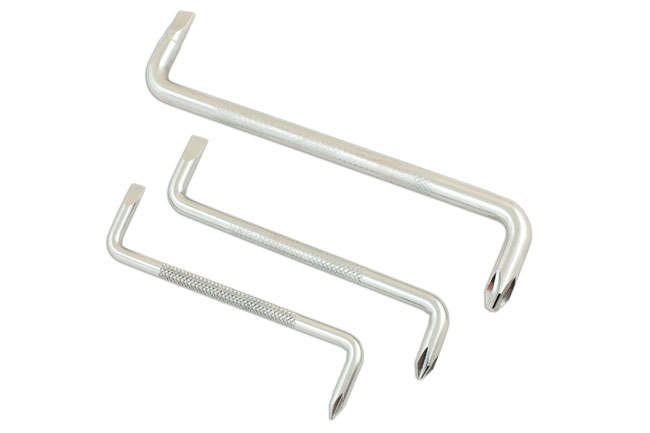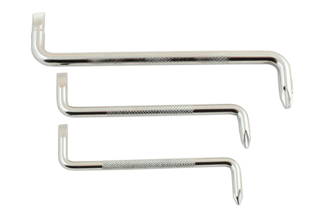 Set of three dual ended offset screwdrivers with Phillips and Flat profiles, for use where access is limited or the screw heads are obscured. Ideal for use in kitchens or bathrooms where screws are hidden behind pipework or other obstacles. Made from one piece forged chrome vanadium for strength, the offset handles are also useful for applying a larger amount torque to undo tight or stubborn screws.