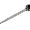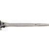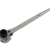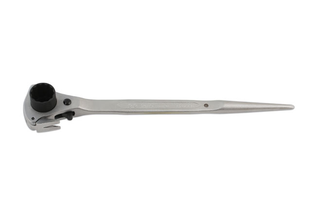 Double-sided ratcheting podger spanner, with retractable nail puller. The tapered shaft provides easy alignment of component holes and there is a twin sided, 19mm and 22mm Bi-Hex (12pt) ratchet head for fast assembly. The spanner is precision engineered to ANSI and DIN standards and manufactured from chrome vanadium with a satin finish. A useful dual function tool, the tool head has a nail puller one side and a square, flat striking face on the other, ideal for scaffolding and building site use.