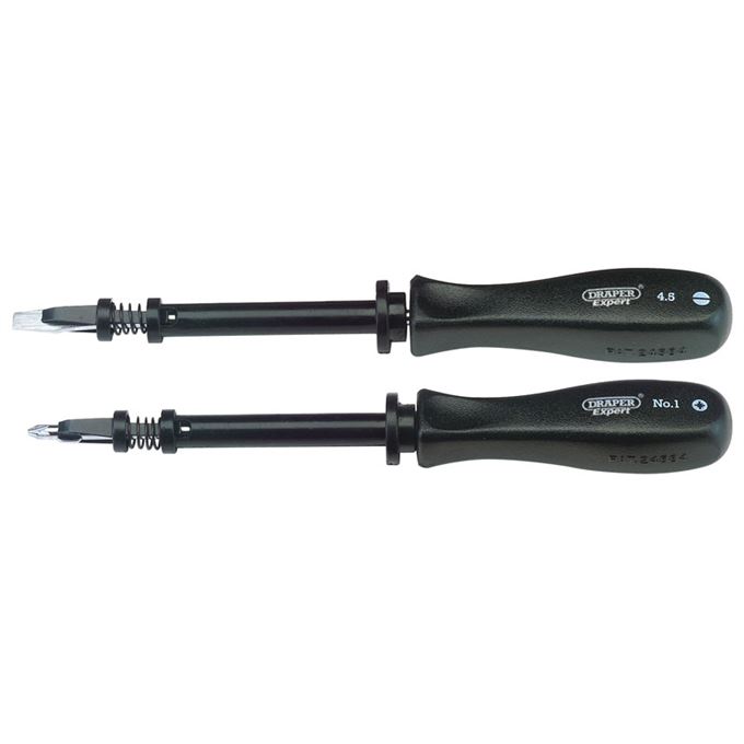 Expert Quality, satin chrome plated SVCM steel blades, hardened and tempered. With a push-pull sleeve for holding and releasing screws. Square matt black handles manufactured from high impact resistant plastic. Display packed.