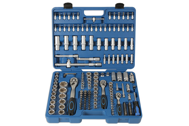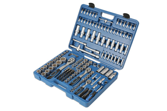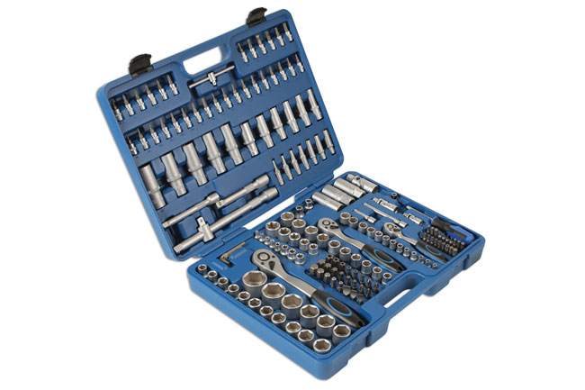 A comprehensive 171 piece socket set, from 4mm – 32mm, with standard and shank bits and a range of accessories. Sockets manufactured from chrome vanadium with satin finish.