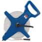 Fibreglass tape, graduated from metres into cm/mm and inches into 1/8″ on reverse. ABS plastic case with grab handle, winding handle and stainless steel eyelet on end of tape. Display packed.