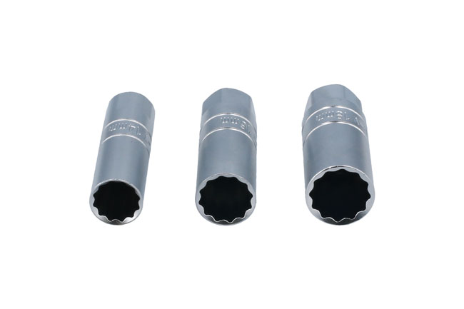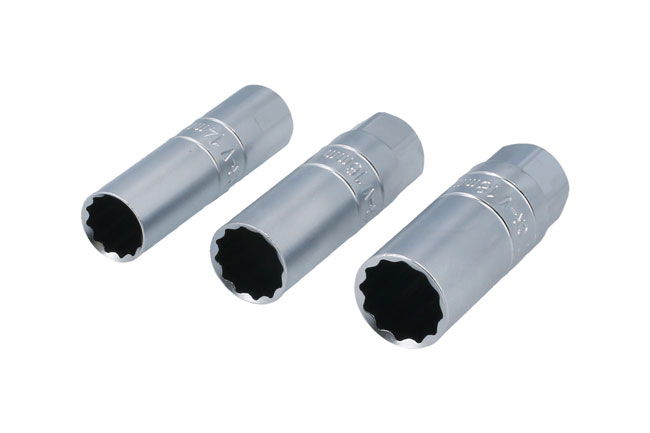 A set of three super-slim spark plug sockets that feature very thin walls to fit the narrow spark plug recesses often found in modern vehicles. Manufactured from chrome vanadium steel for strength and durability, they also feature a rubber insert to grip the spark plug safely.