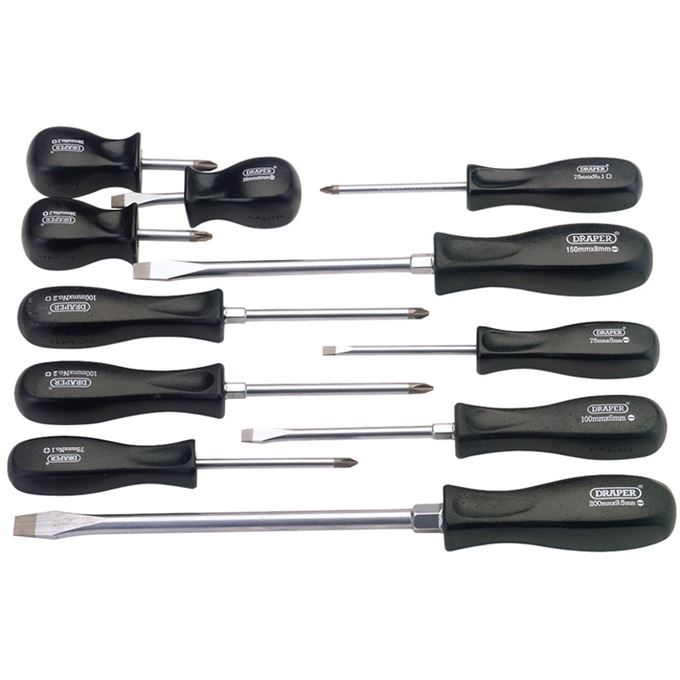 Expert Quality, satin chrome plated SVCM steel blades, hardened and tempered with sand blasted tip. Some sizes have a hexagon bolster which enables extra power to be obtained by use of a spanner (+). Square matt black handles manufactured from high impact resistant plastic. Display packed.
