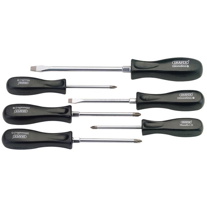 Expert Quality, satin chrome plated SVCM steel blades, hardened and tempered with sand blasted tip. Some sizes have a hexagon bolster which enables extra power to be obtained by use of a spanner (+). Square matt black handles manufactured from high impact resistant plastic. Display packed.